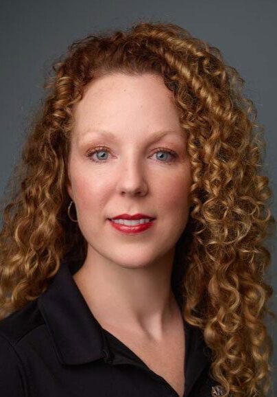 Curly-haired woman with a neutral expression.